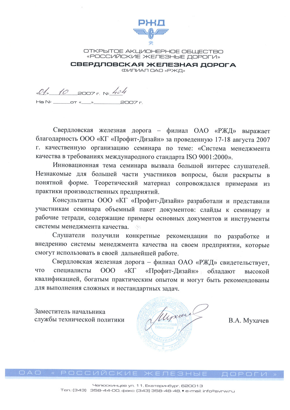 Свердловская железная дорога – филиал ОАО «РЖД» (г. Екатеринбург):