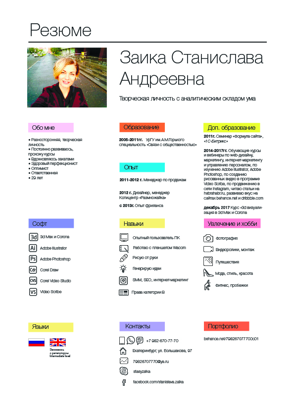 Хобби: дизайн интерьеров, фотография, видеомонтаж, путешествия, мода, фитнес. Опытный пользователь ПК, 3d Max, Corona Render, Vrey, Adobe Illustrator, Adobe Photoshop, Corel Draw, Video Scribe, Corel Video Studio, SMM в Instagram, работаю с планшетом Wacom, рисую от руки, Анимация.
